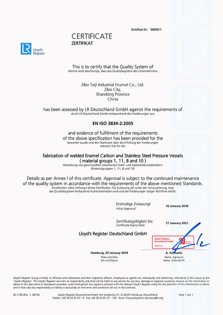 淄博太極在中國(guó)搪玻璃設(shè)備制造行業(yè)中首家通過(guò)ISO90001質(zhì)量體系認(rèn)證,并擁有美國(guó)ASME認(rèn)證、歐洲PED認(rèn)證以及國(guó)家部門頒發(fā)的搪玻璃制造許可證、進(jìn)出口許可證和百余項(xiàng)榮譽(yù)證以及三十六項(xiàng)專利等。
